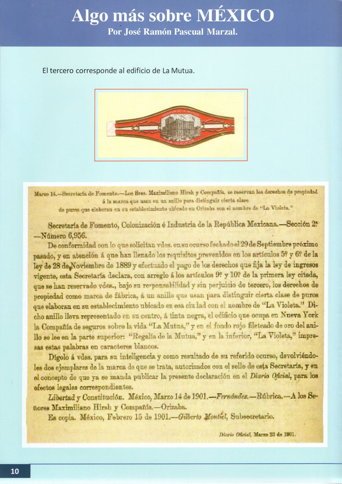 Seguramente, el ofrecimiento del suegro de Gustav también debió abarcar la financiación para la compra de dos fábricas de puros: La Sin Rival y La Violeta, esta última fundada por Maximiliano Hirsch en 1898, que aparece con frecuencia como habilitador y exportador en San Andrés Tuxtla y Orizaba. Su fábrica de Orizaba estaba en el callejón de Rocha nº 1 (entre Norte 10 y Oriente 4-6) (*7). La Violeta debió pasar a formar parte del imperio tabaquero de Manuel P. García y su marca principal La Rica Hoja, como se puede comprobar en algunas anillas de la marca donde figura el número de registro 144 (ver anilla con retrato de Alfonso XIII un poco más abajo de esta página).